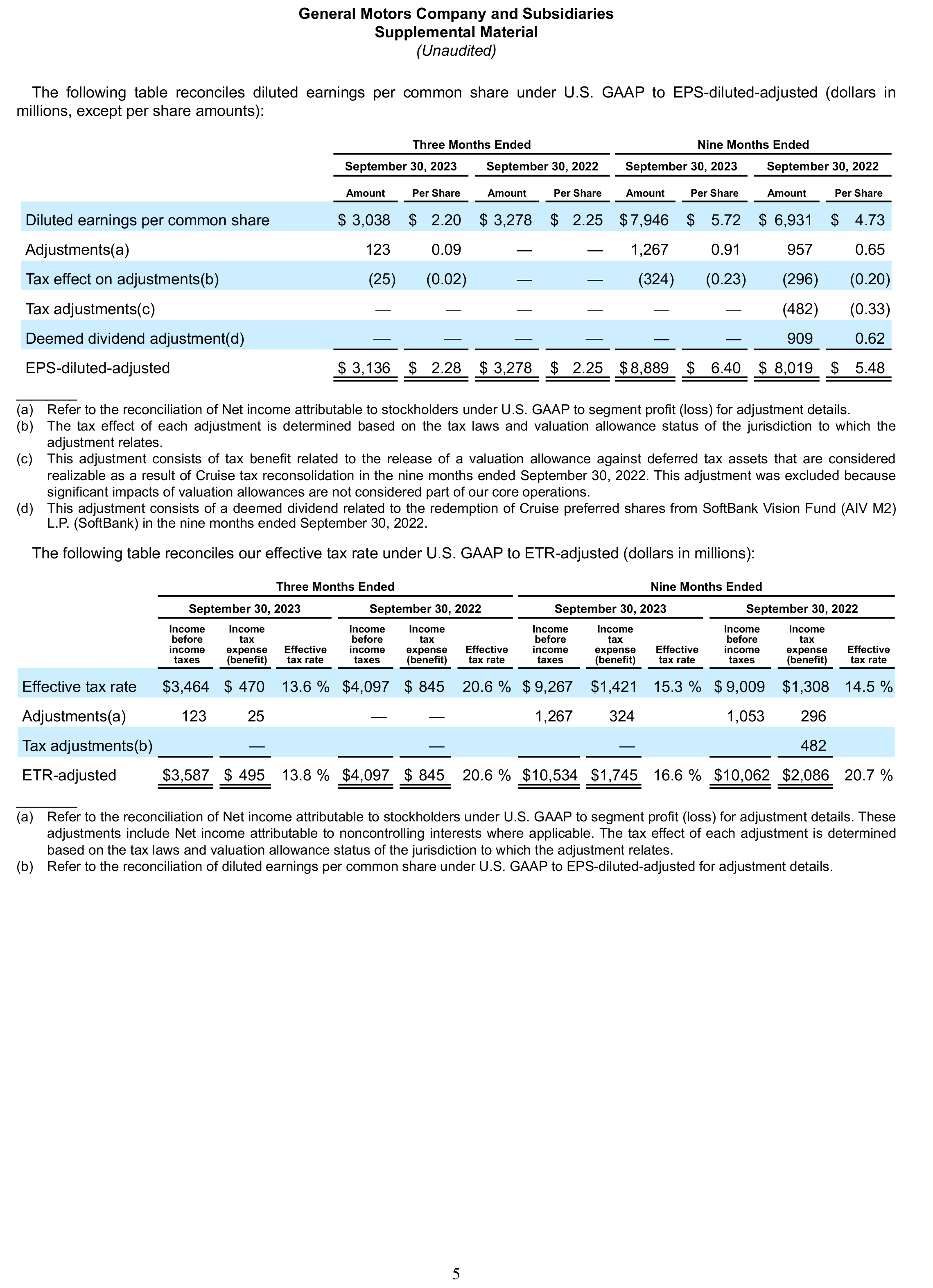 General Motors Company's (GM) non-GAAP measures include: earnings before interest and taxes (EBIT)-adjusted, presented net of noncontrolling interests; earnings before income taxes (EBT)-adjusted for our General Motors Financial Company, Inc. (GM Financial) segment; earnings per share (EPS)-diluted-adjusted; effective tax rate-adjusted (ETR-adjusted); return on invested capital-adjusted (ROIC-adjusted) and adjusted automotive free cash flow. GM's calculation of these non-GAAP measures may not be comparable to similarly titled measures of other companies due to potential differences between companies in the method of calculation. As a result, the use of these non-GAAP measures has limitations and should not be considered superior to, in isolation from, or as a substitute for, related U.S. GAAP measures.