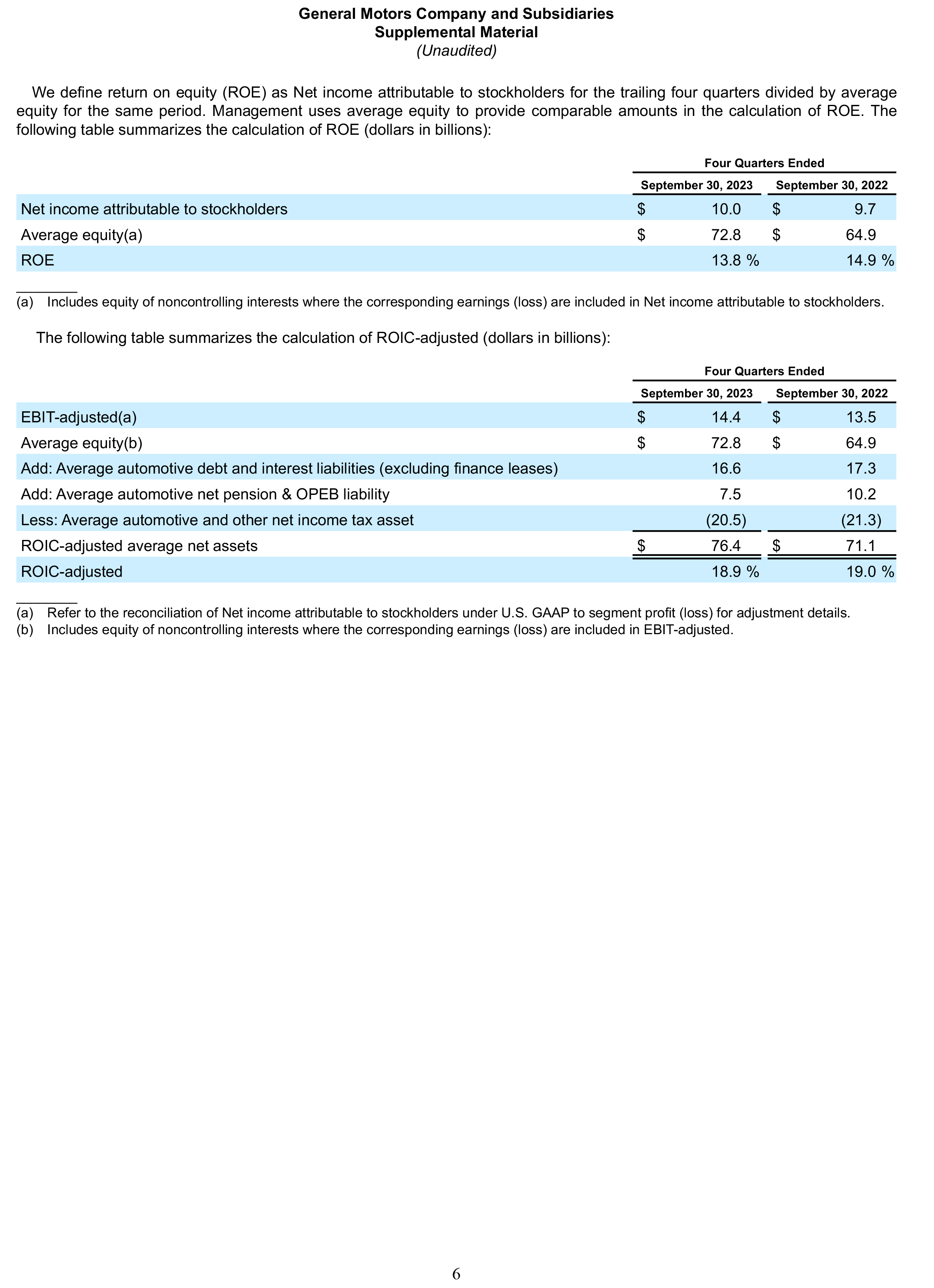 ROIC-adjusted ROIC-adjusted is used by management and can be used by investors to review our investment and capital allocation decisions. We define ROIC-adjusted as EBIT-adjusted for the trailing four quarters divided by ROIC-adjusted average net assets, which is considered to be the average equity balances adjusted for average automotive debt and interest liabilities, exclusive of finance leases; average automotive net pension and other postretirement benefits (OPEB) liabilities; and average automotive net income tax assets during the same period.